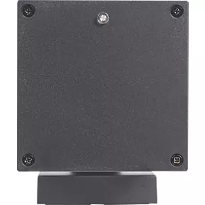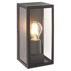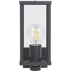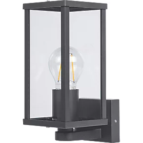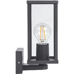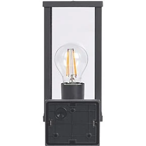 Modern top / bottom arm wall lantern in slate grey with glass panels. Single E27 lampholder, ideal for LED filament lamps.